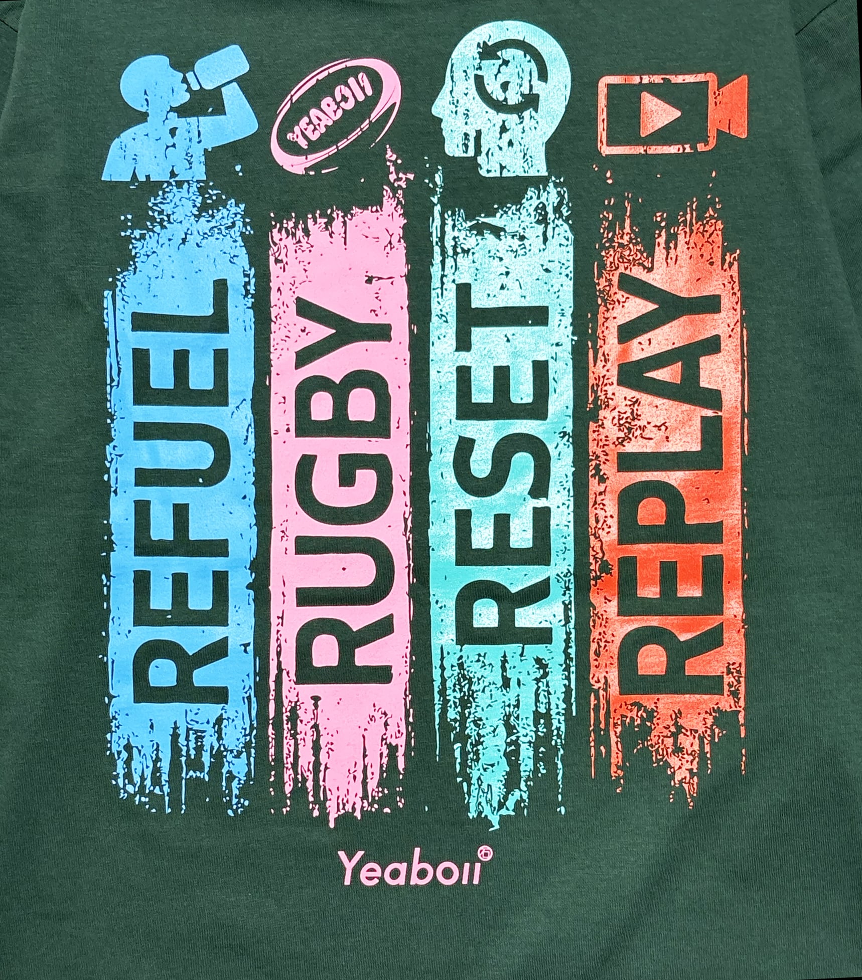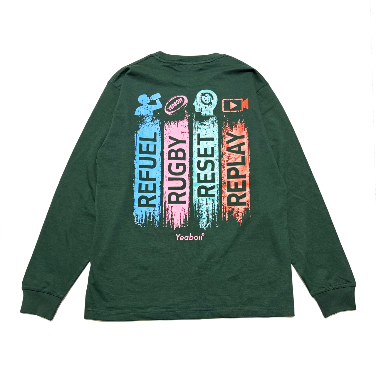 ラグビーにとってとても大事なキーワードをバックプリントに大きくカラフルにプリントしています。